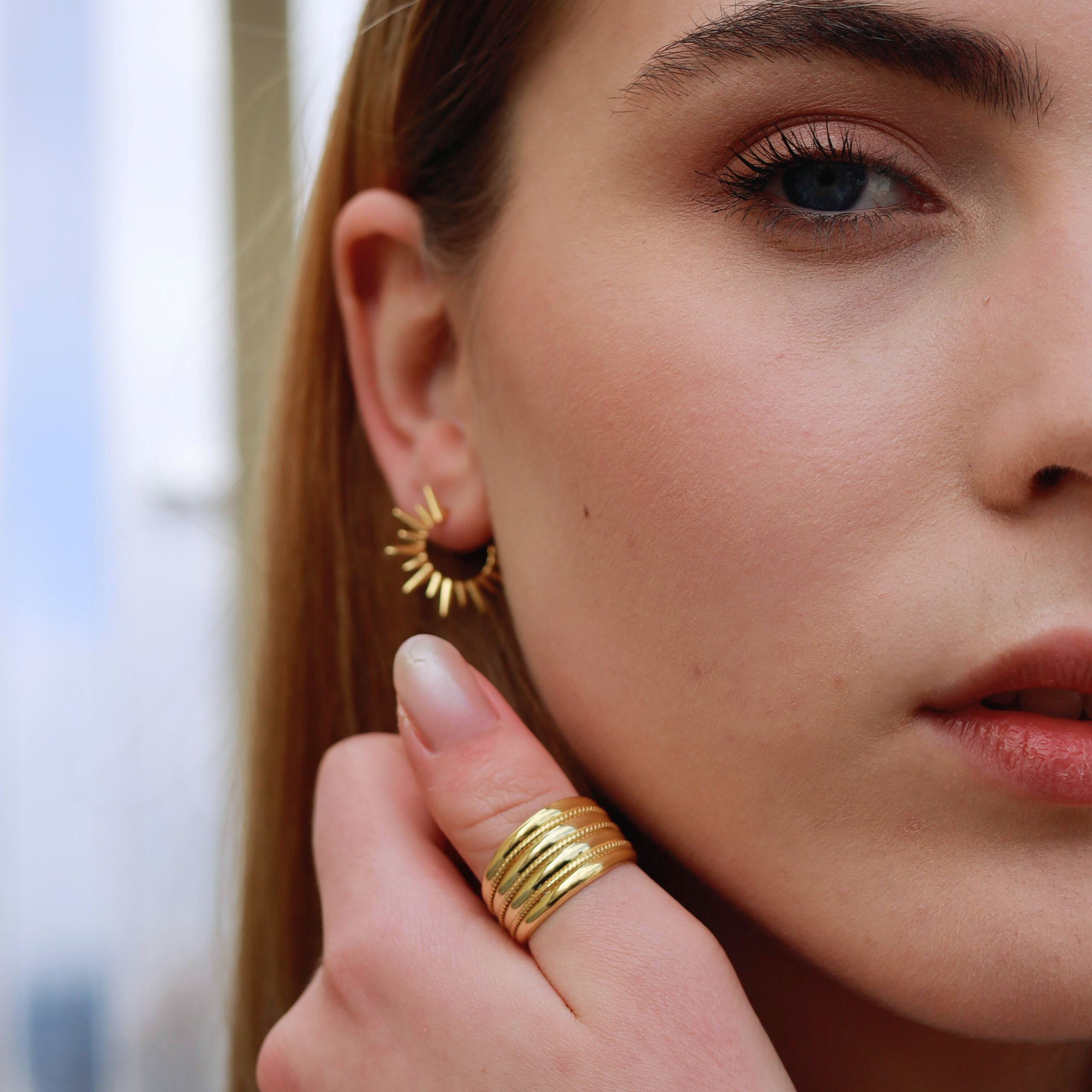 Anillo con diseño de cuádruple banda dorada intercalada con hilos dorados estilo cuerda, y grosor de 14 mm.