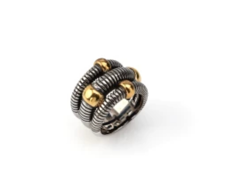 Anillo de diseño entrelazado, con acabado en acero oscuro y detalles en tono dorado. Una pieza con volumen y textura, inspirada en cadenas y estructuras industriales.Su forma envolvente aporta presencia sin resultar incómoda. Ideal para llevar solo como anillo protagonista o combinado con piezas más minimal.Fabricado en acero inoxidable 316L, resistente y pensado para el uso diario.