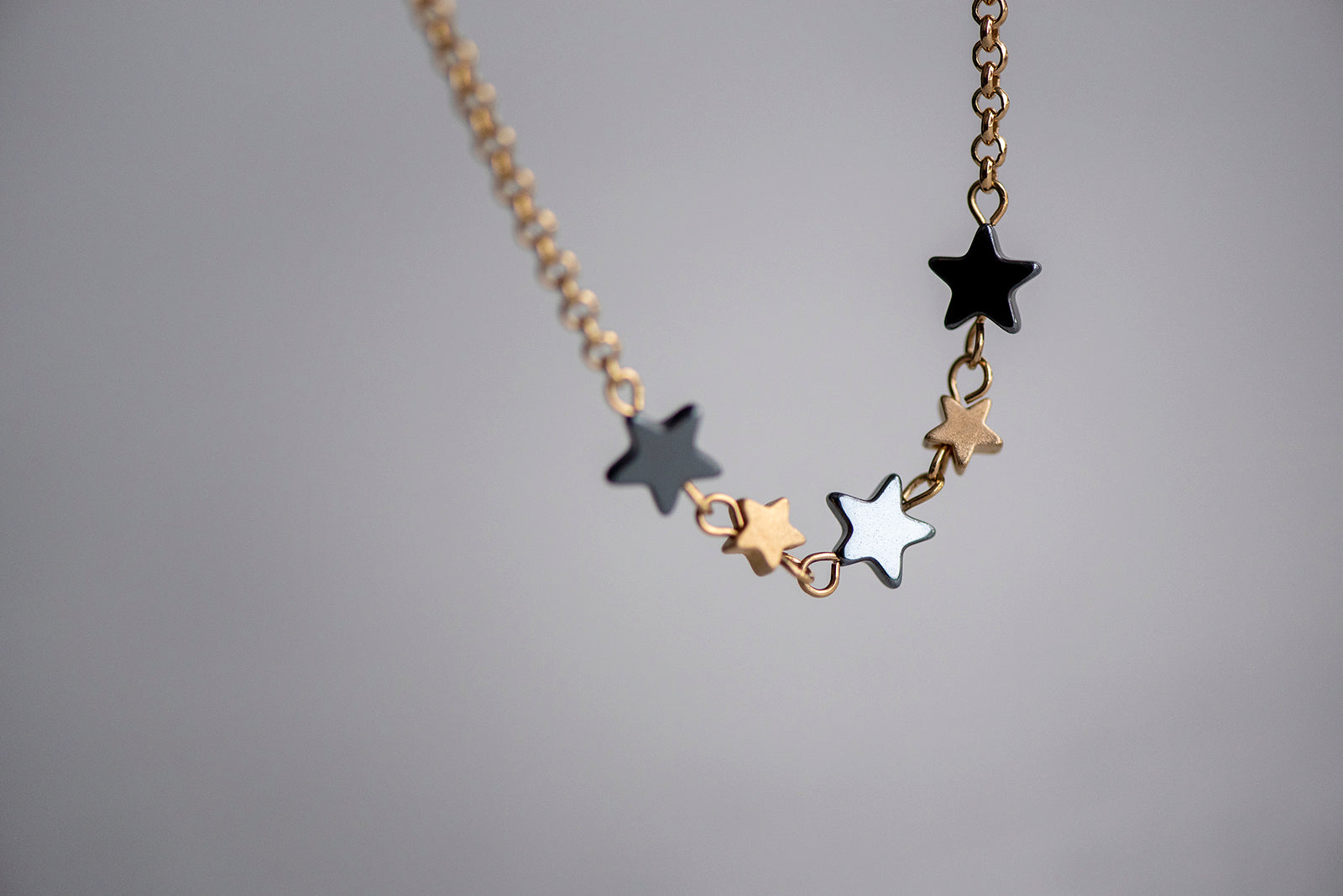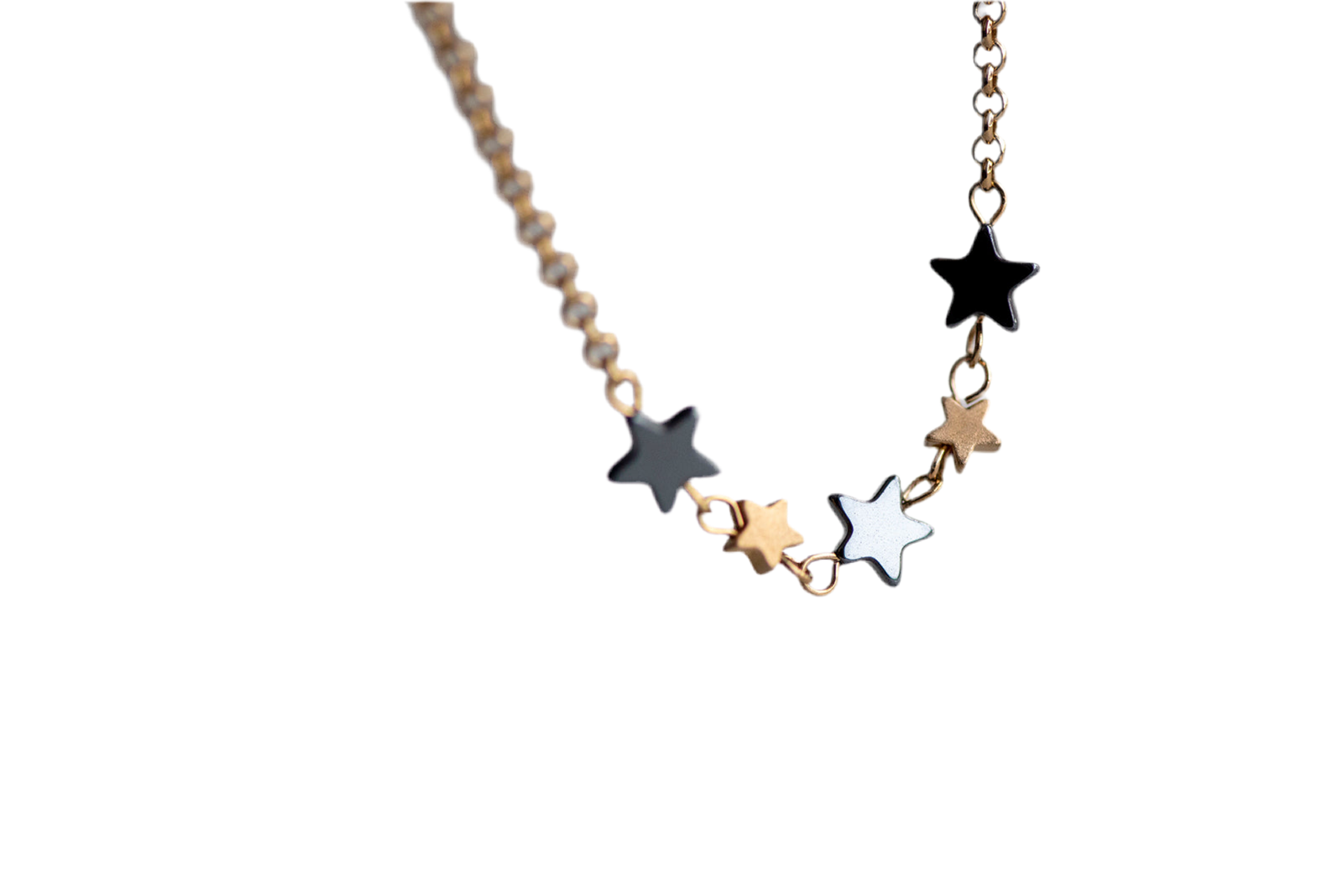 Collar chapado oro 18 quilates con estrellas de oro mate y vidrio fundido en gris.