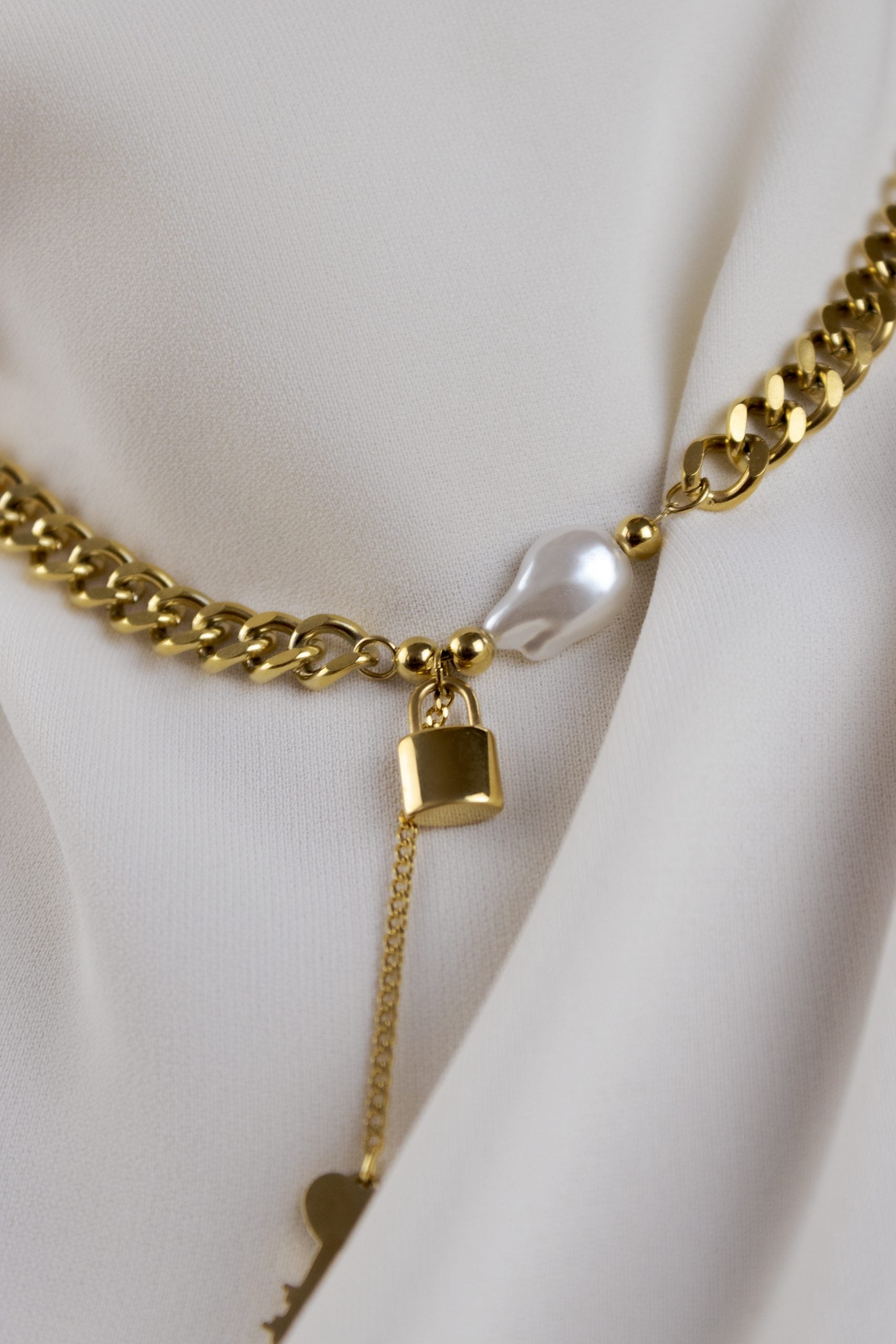 Collar de acero inoxidable bañado en oro de 18 quilates con eslabón maxi de 8mm con una perla de río y un candado, junto con un colgante en forma de llave.