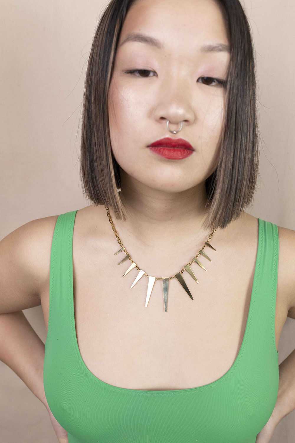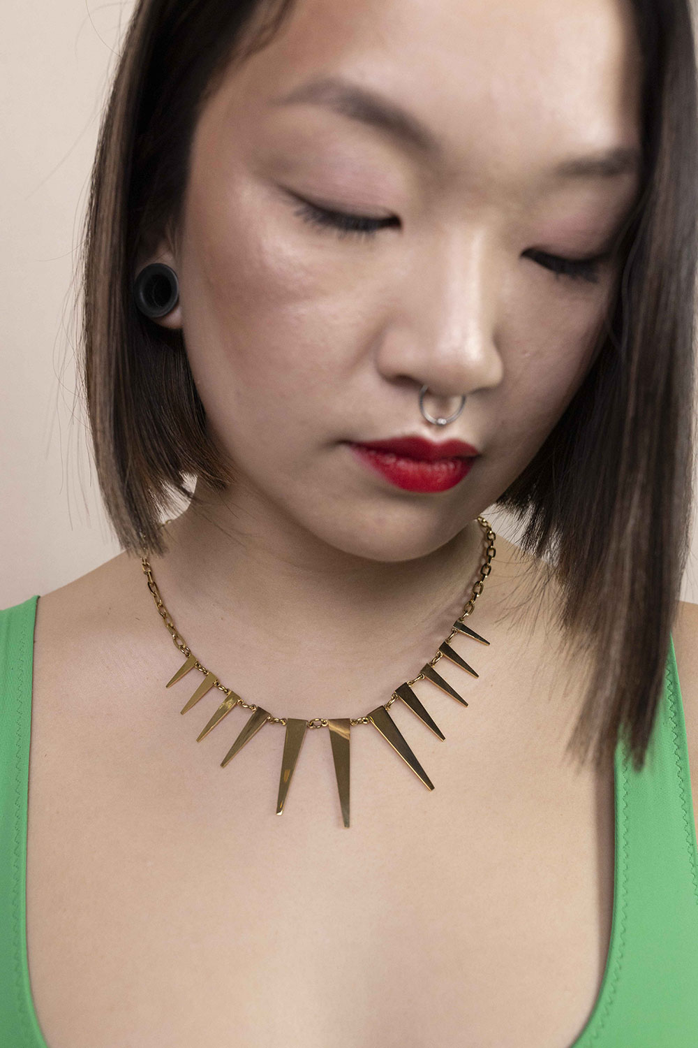 Diseñado en acero inoxidable hipoalergénico, chapado en oro de 18 quilates, con una estructura firme decorada con pinchos metálicos, este collar de 45 cm más 6 cm de alargador se ajusta con precisión, cerca de la piel, como un escudo suave y afilado.
