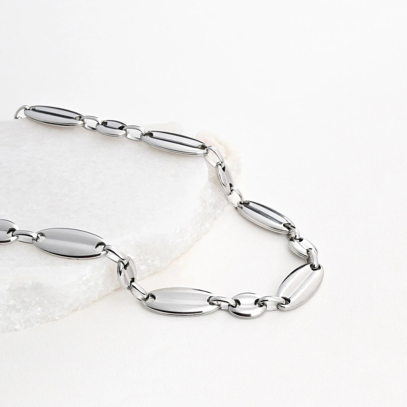 Eleva tu estilo con esta cadena de eslabón mediano fabricada en acero inoxidable plateado de alta calidad. Con un largo ajustable de 45 a 50 cm, se adapta perfectamente a diferentes estilos y ocasiones. Su diseño moderno y en tendencia la convierte en un accesorio imprescindible para quienes buscan una pieza versátil y contemporánea.