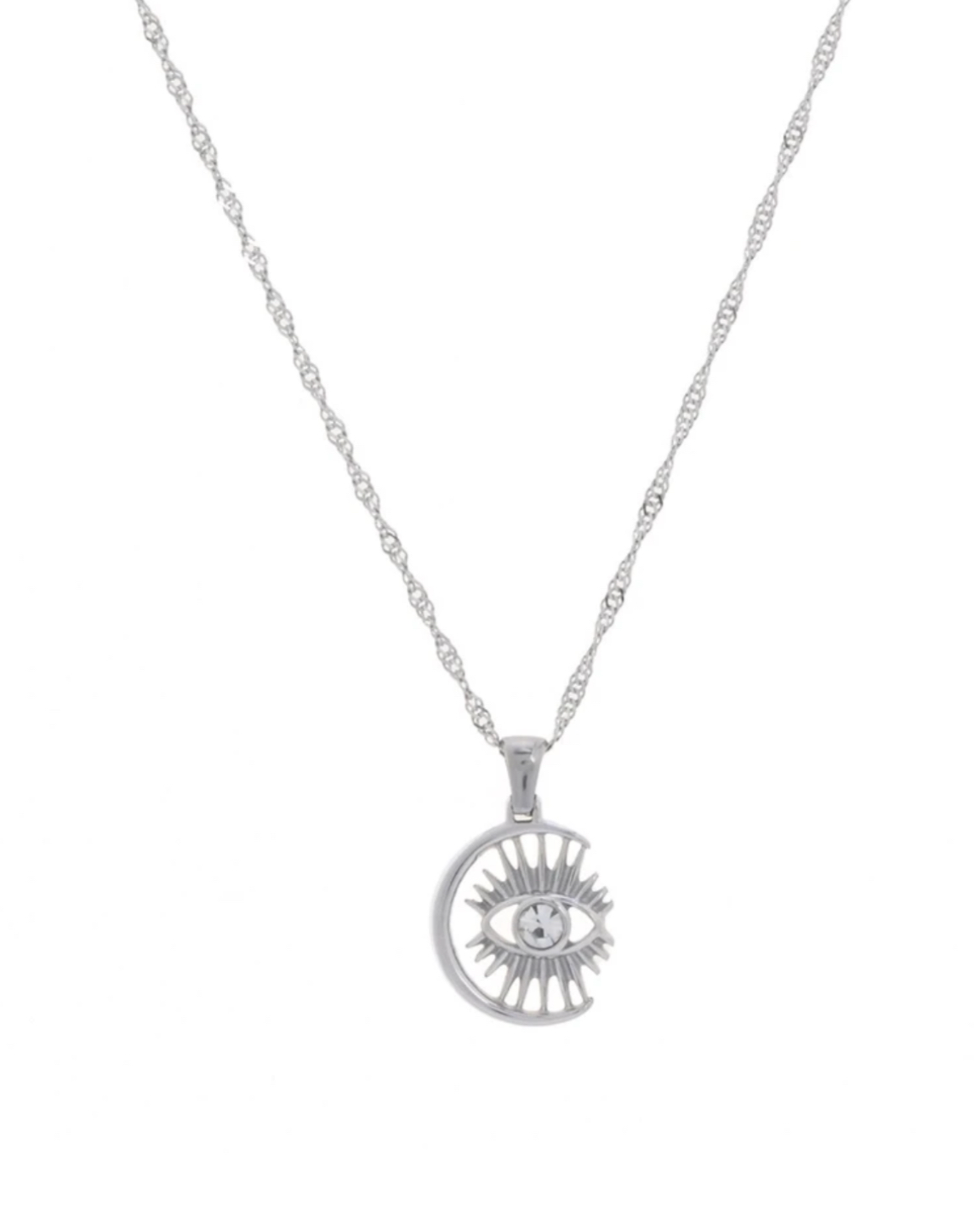 El collar MOON EYE NECKLACE 45 es un amuleto contemporáneo cargado de simbolismo. Con cadena de acero hipoalergénico de 45 cm de largo, lleva un colgante en forma de media luna con un ojo central y circonita que brilla como un talismán de protección y energía. Una joya ligera y versátil, pensada para llevar a diario o combinar en capas con otros collares. Perfecta para quienes buscan estilo con intención