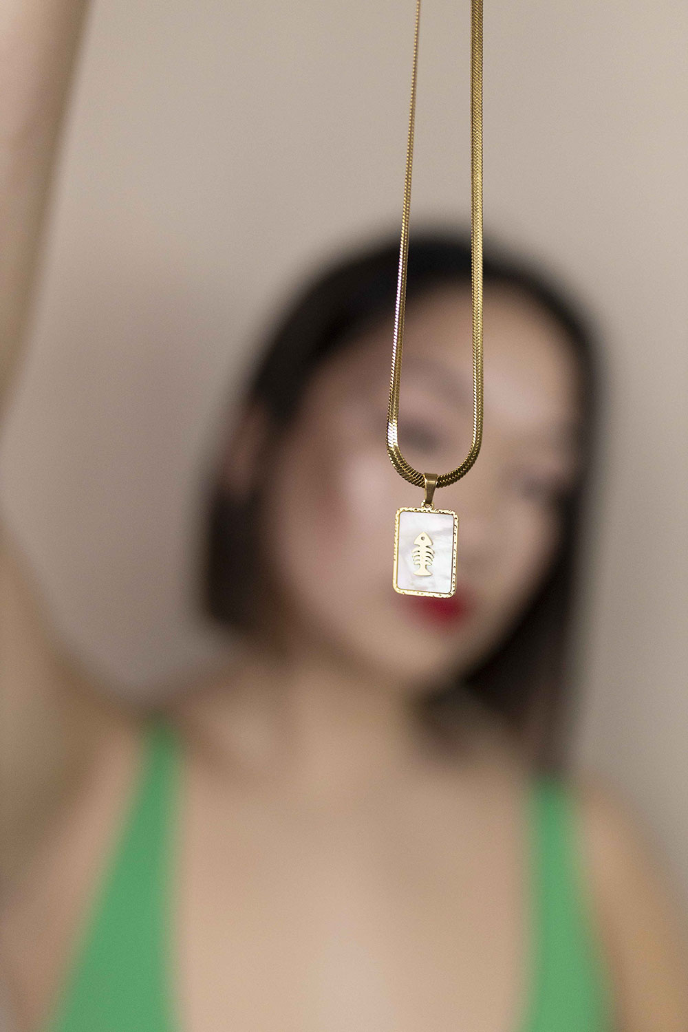 Collar chapado en oro 18 quilates. Cadena plana y medalla de nácar con motivo.