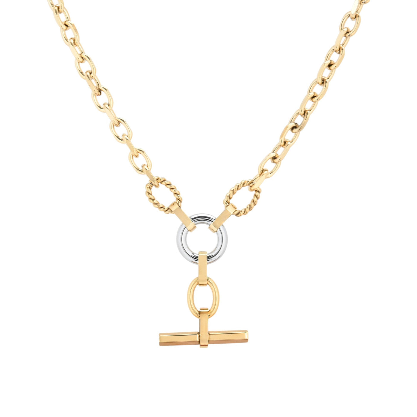 El Collar Nexus es una declaración de estilo: bicolor, chunky y con cierre T-Bar frontal que no pasa desapercibido. Fabricado en acero inoxidable 316L hipoalergénico, combina un baño de oro 18K con detalle central en tono plateado, creando un contraste único y sofisticado.