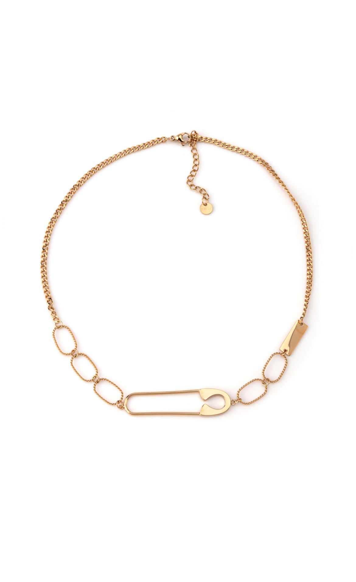 Un collar que no pasa desapercibido. Fabricado en acero inoxidable 316L, este diseño mezcla fuerza y rebeldía en una sola pieza. La cadena combina eslabones clásicos con un detalle protagonista en forma de imperdible XL, símbolo de actitud punk y de estilo sin reglas.
