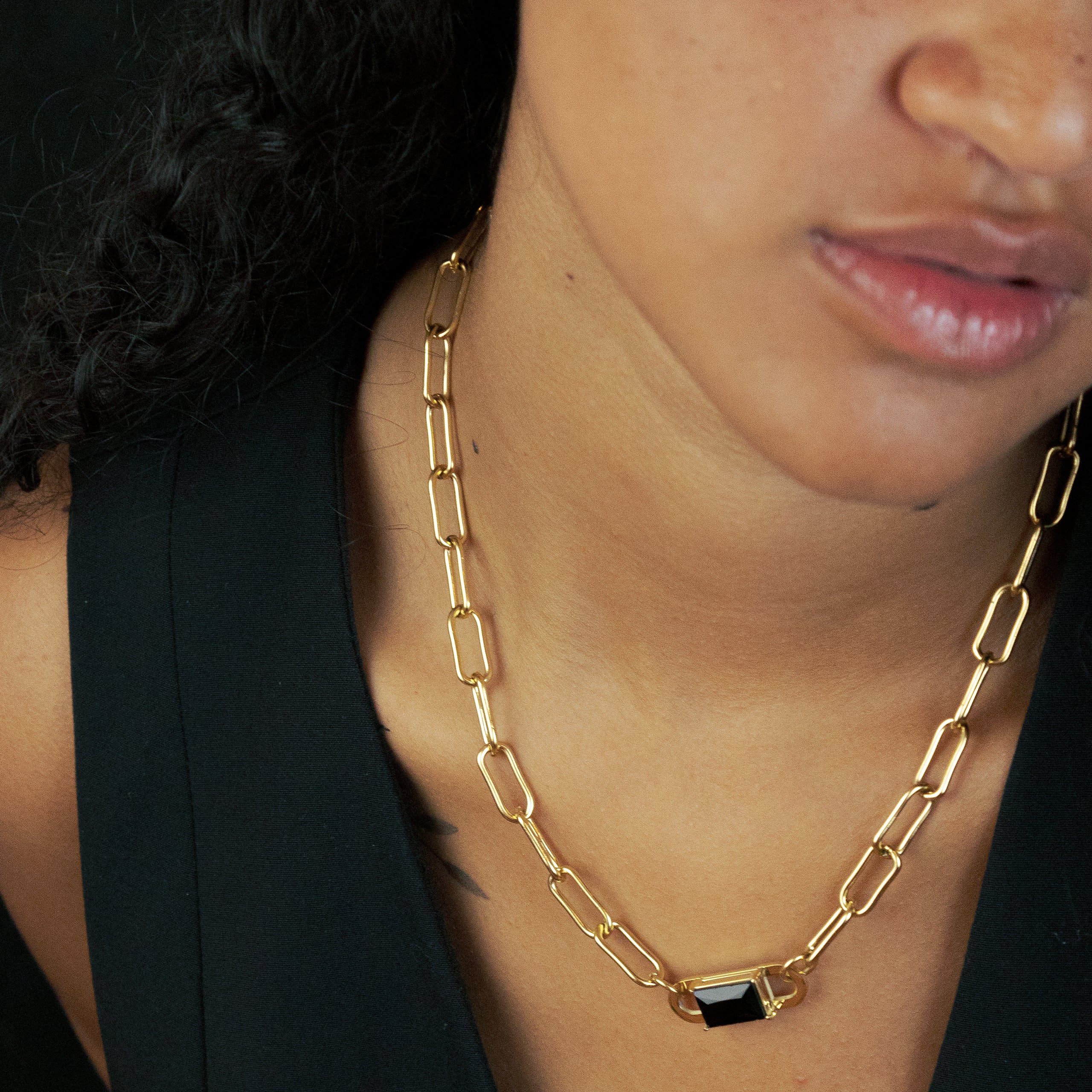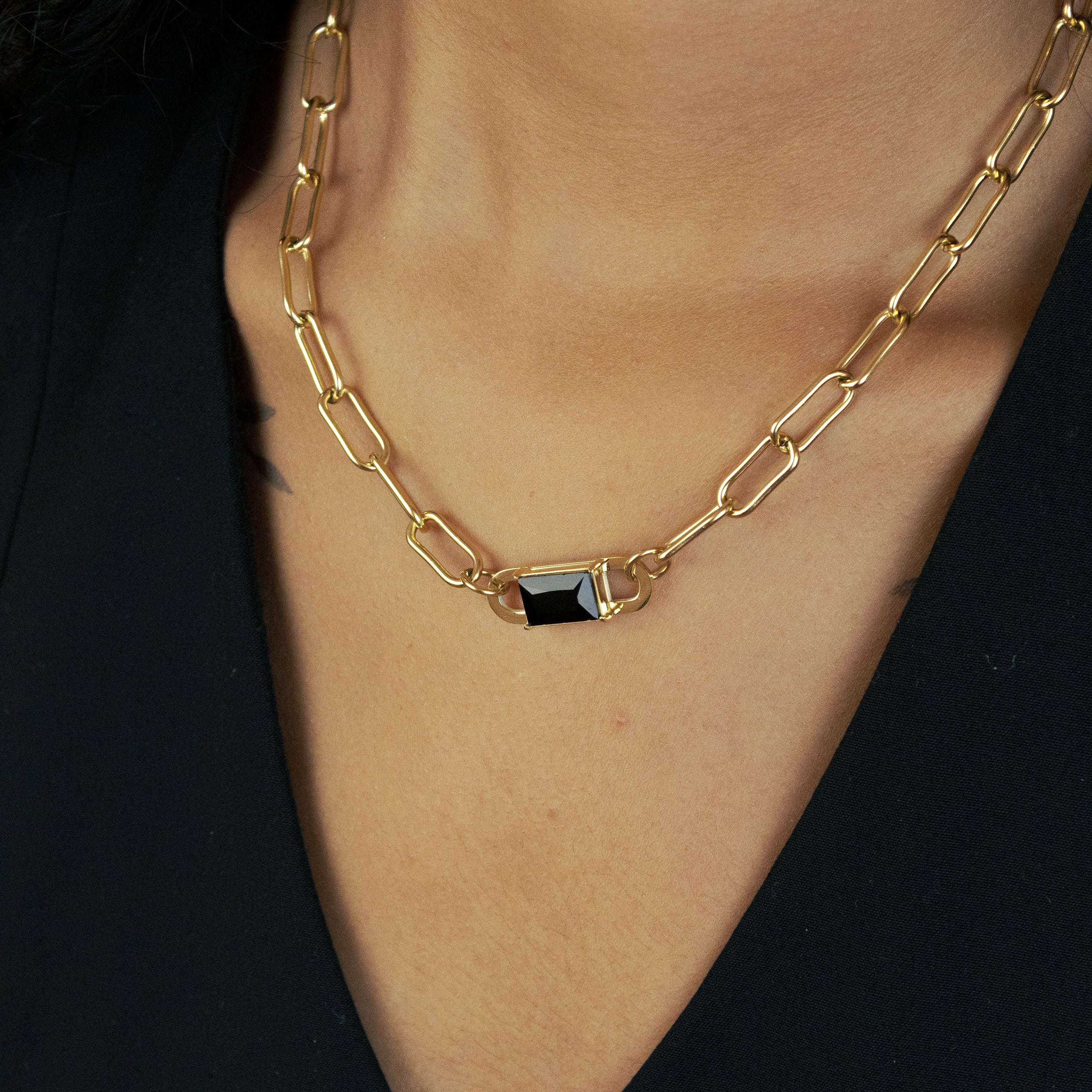 El Collar Vela es una joya que combina elegancia y audacia. Fabricado en acero inoxidable hipoalergénico y bañado en oro de 18 quilates, este choker destaca por su diseño de eslabones de 15 mm y un eslabón central de 25 mm adornado con una circonita rectangular negra. Su longitud de 45 cm, ampliable con un alargador de 6 cm, lo hace versátil y ajustable a diferentes estilos y ocasiones. Además, es resistente al agua, lo que garantiza su durabilidad y brillo en el tiempo.