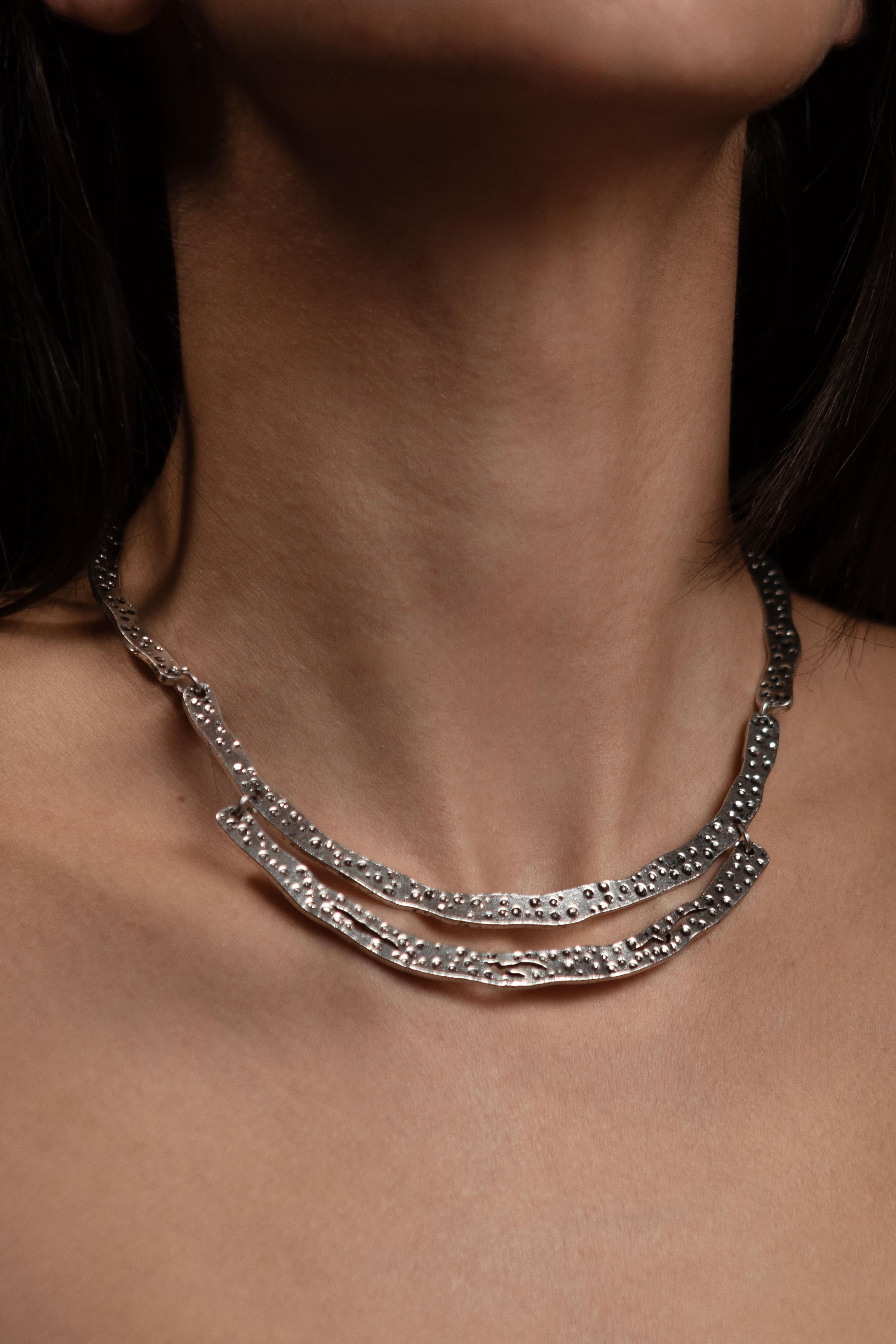 Con una medida de 40 cm + 6 cm de alargador, su silueta irregular aporta fuerza y estilo a cualquier look: desde un top básico hasta una camisa abierta con intención. Cada unidad se produce en edición limitada, pensada para quienes no siguen reglas y entienden que una joya puede ser más que un adorno: una declaración.