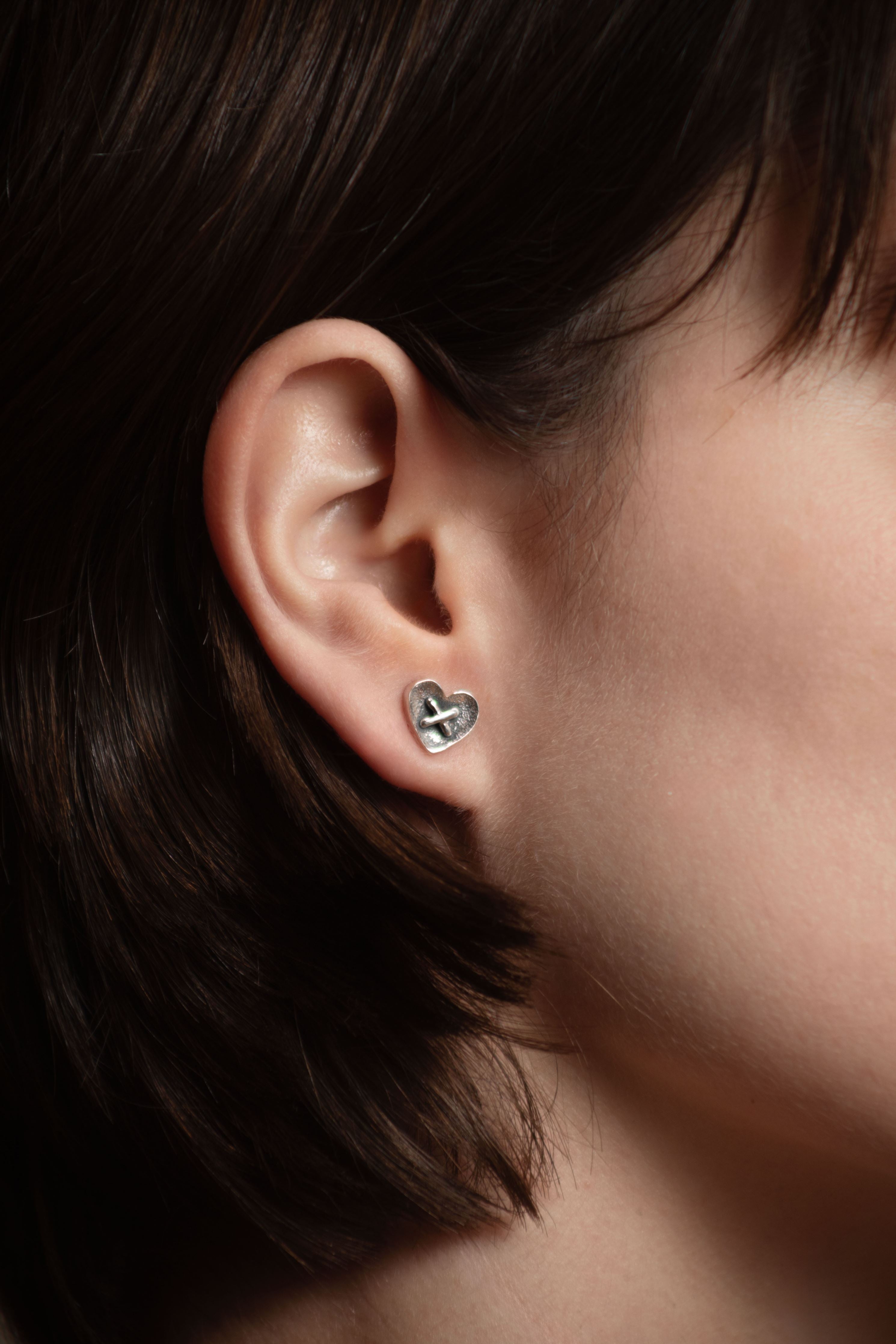 Forjados en plata de ley 925 con acabado envejecido, estos mini pendientes de 1,5 cm simbolizan una cruz cosida: la herida que ya no duele, el corazón que se rompió y volvió a latir con más fuerza.