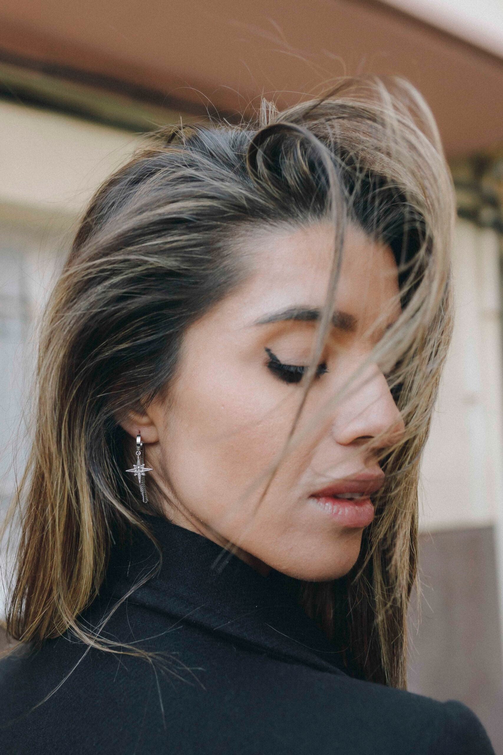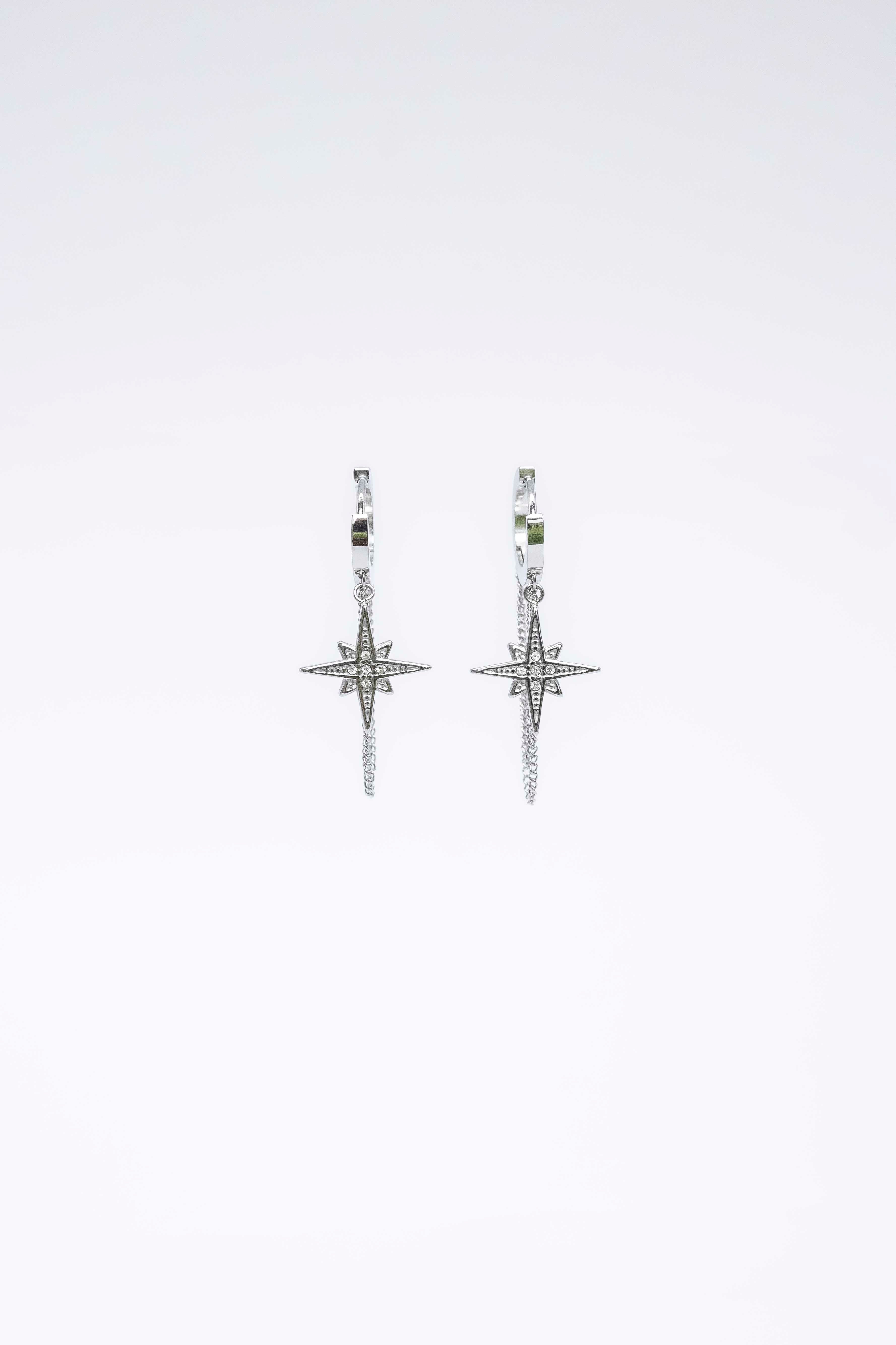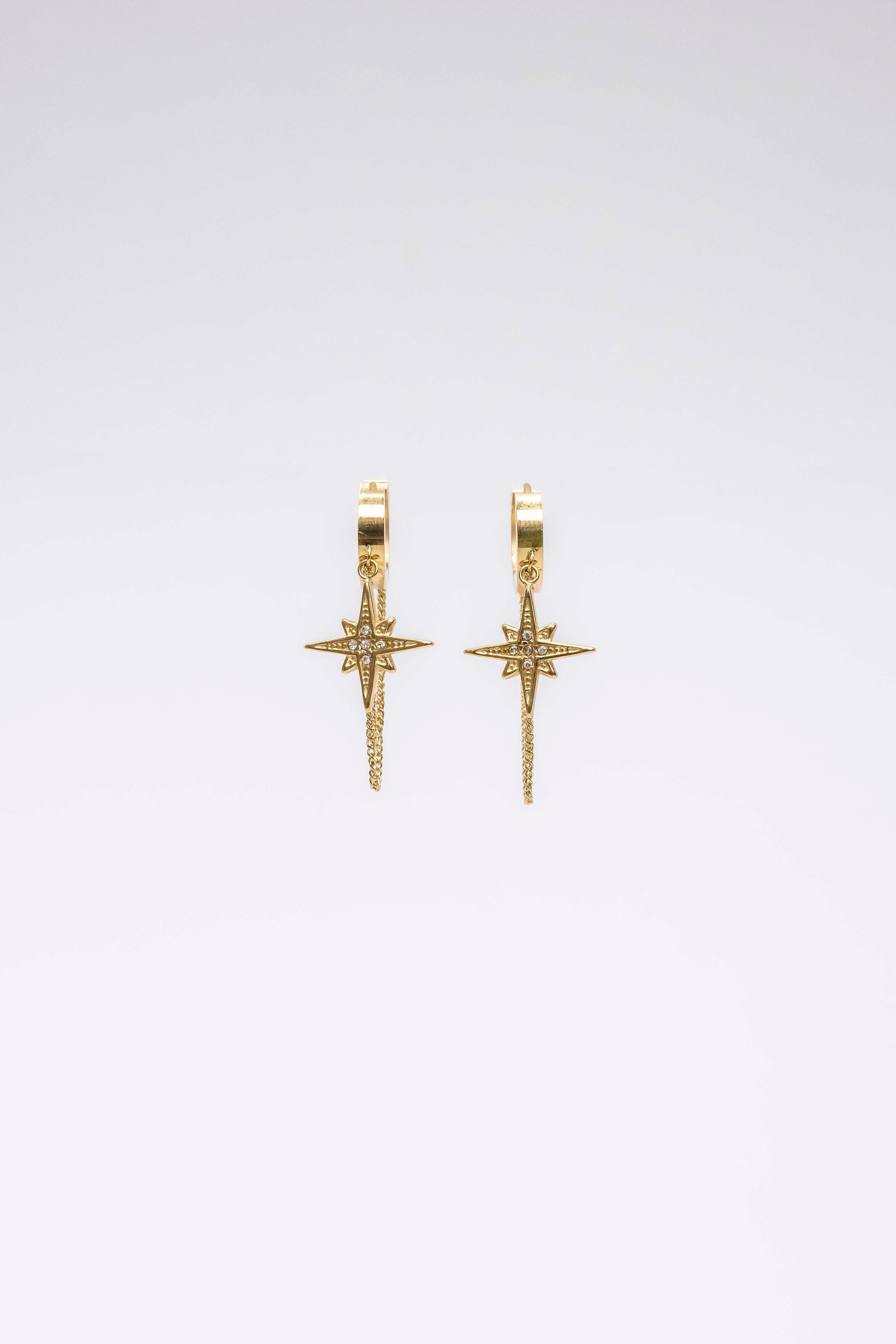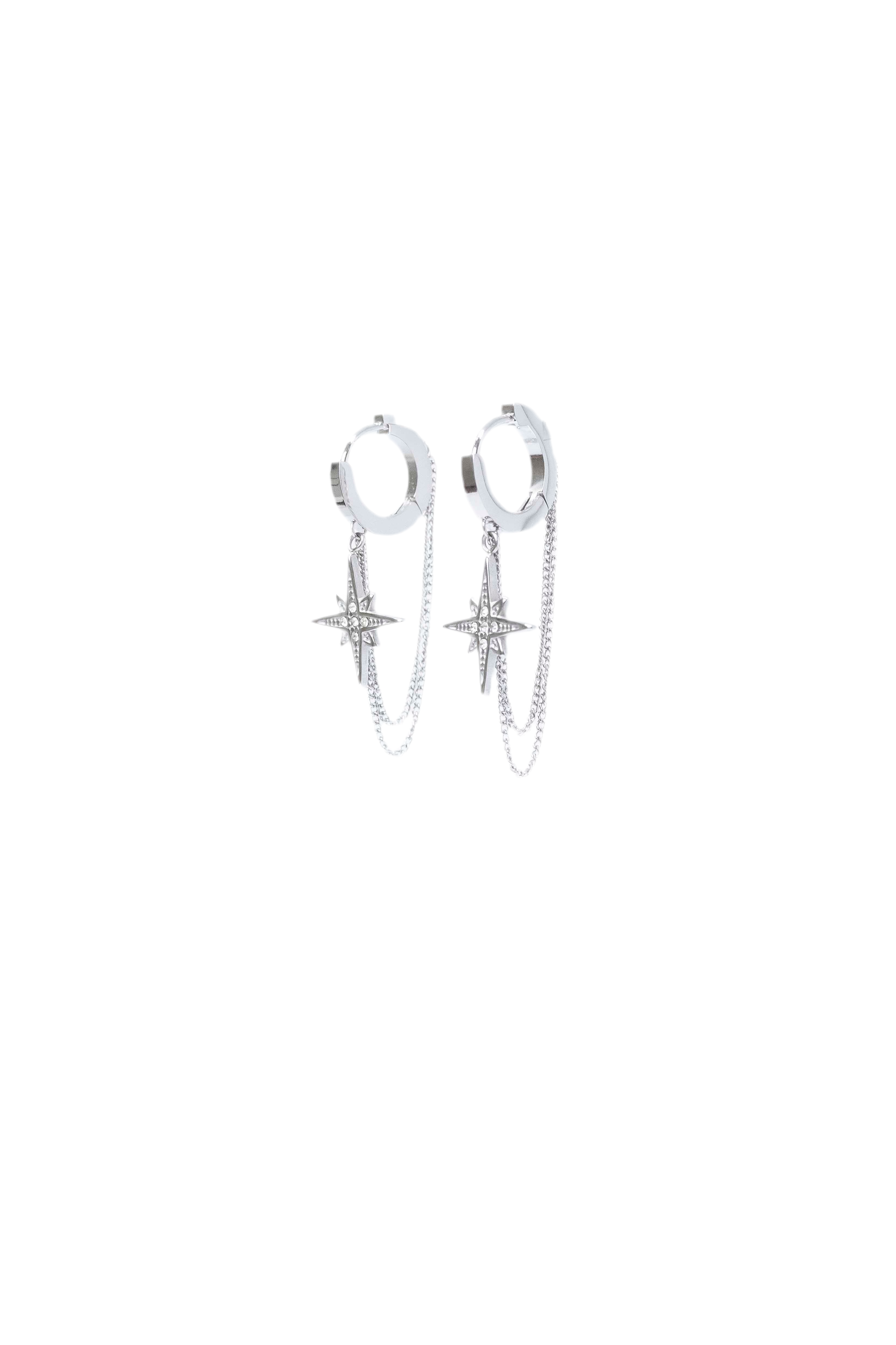 Pendientes de acero hipoalergénico con forma de rosa de los vientos y cadenas.