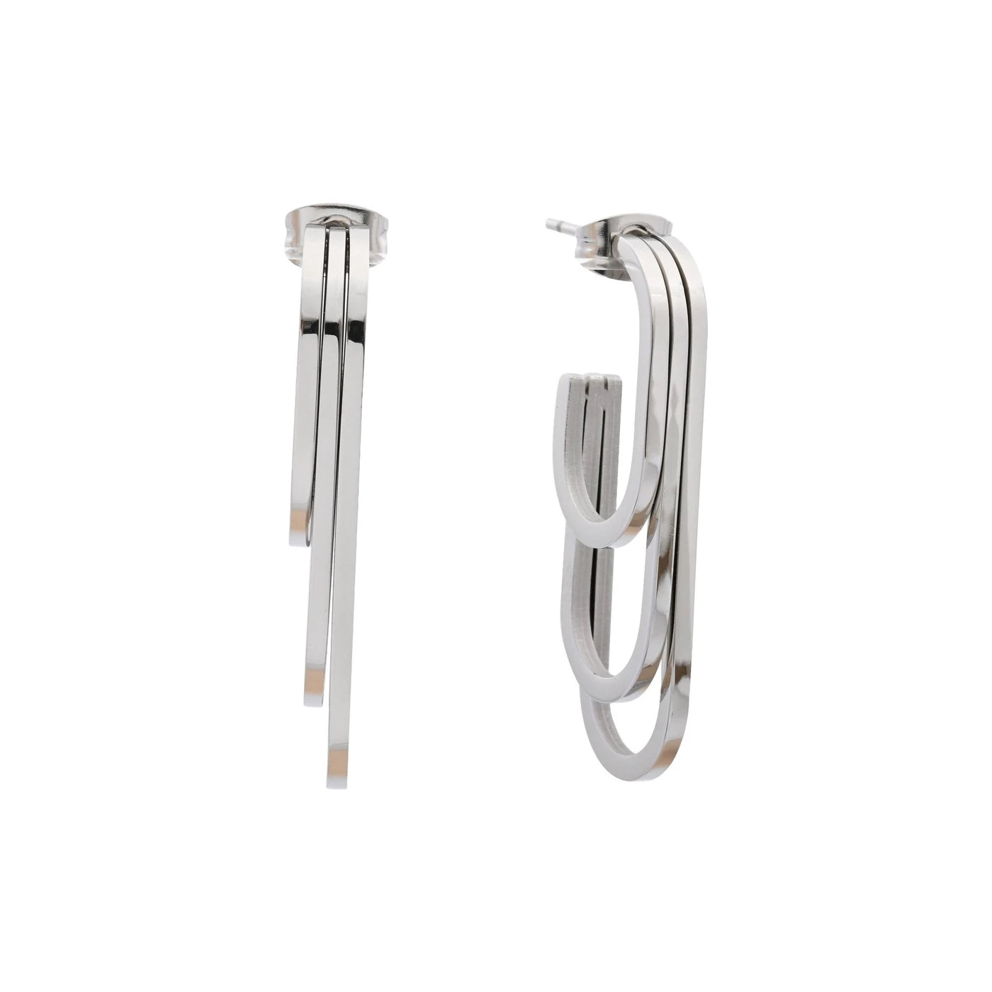 STAPLED es un par de pendientes largos en acero inoxidable 316L con un diseño inspirado en formas industriales y arquitectónicas. Su estructura geométrica, formada por líneas paralelas que se curvan y cruzan entre sí, aporta una estética limpia, moderna y absolutamente rompedora.