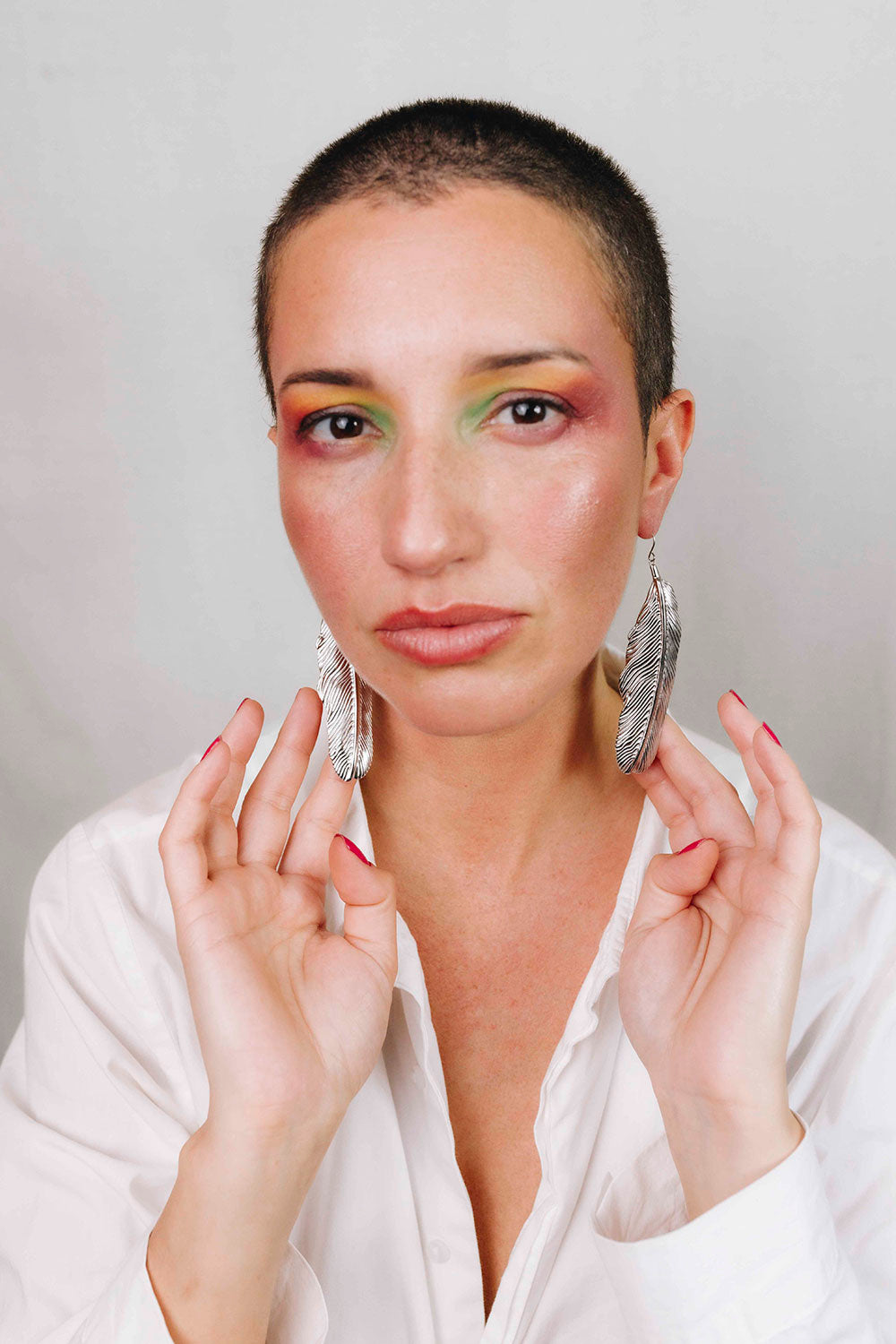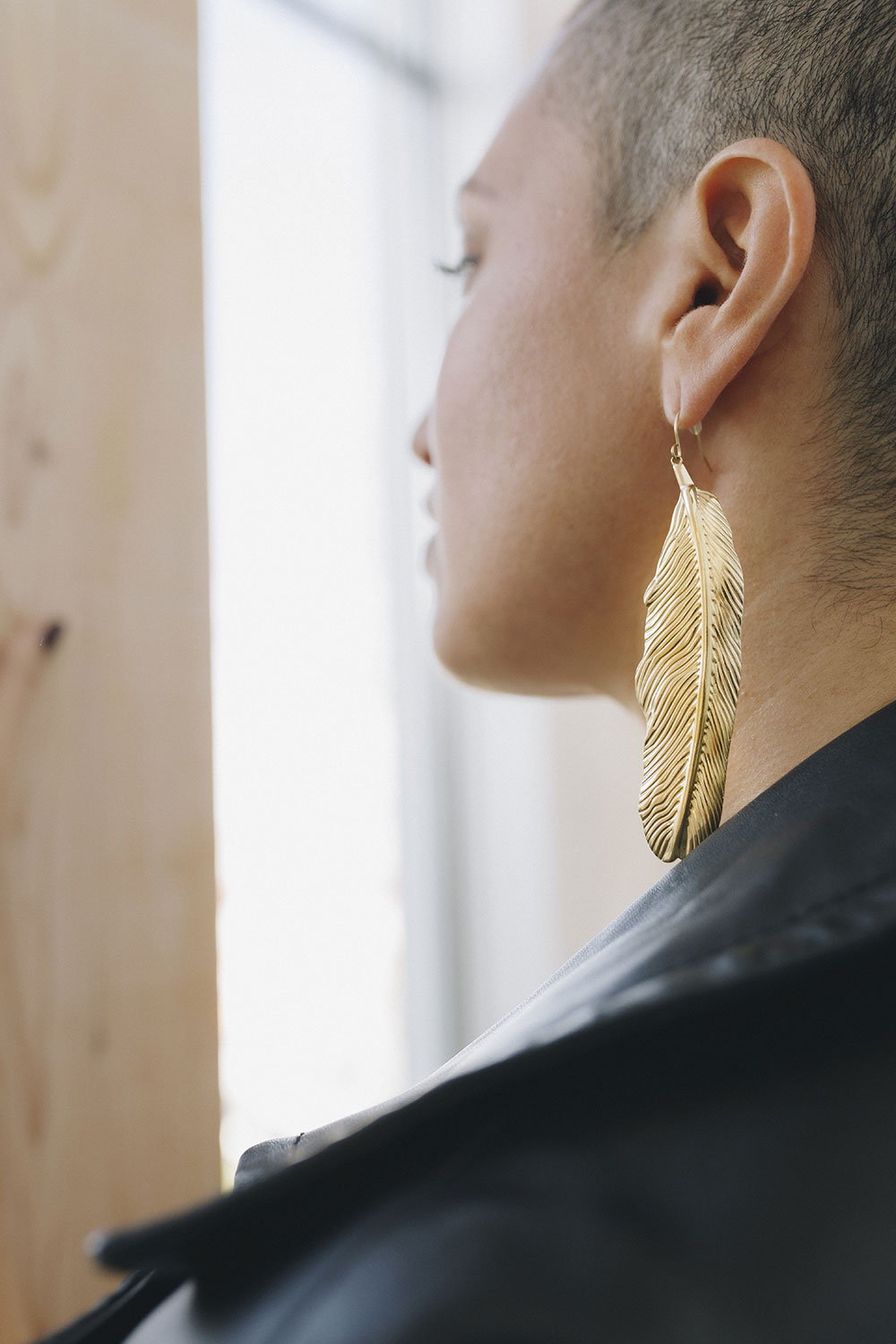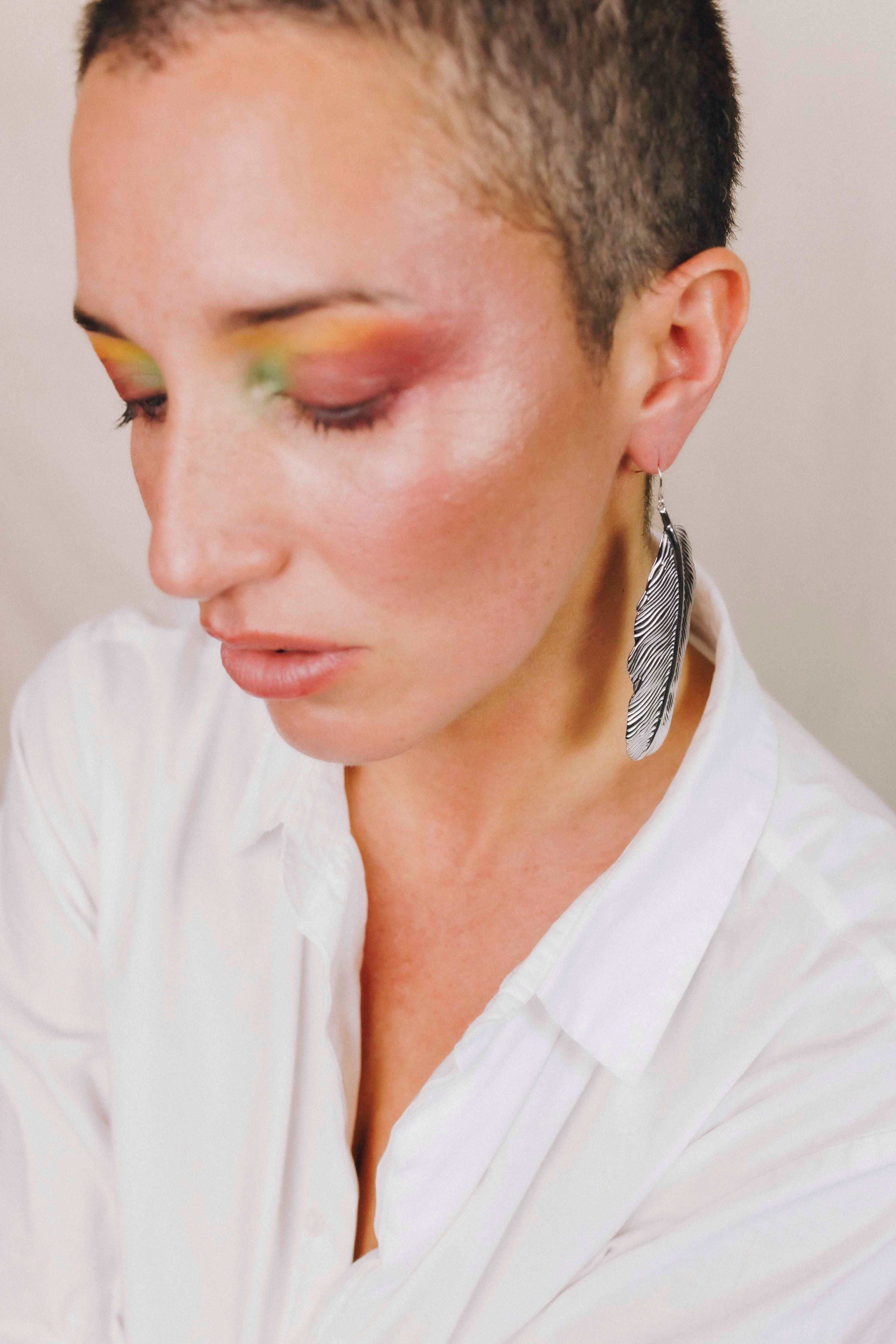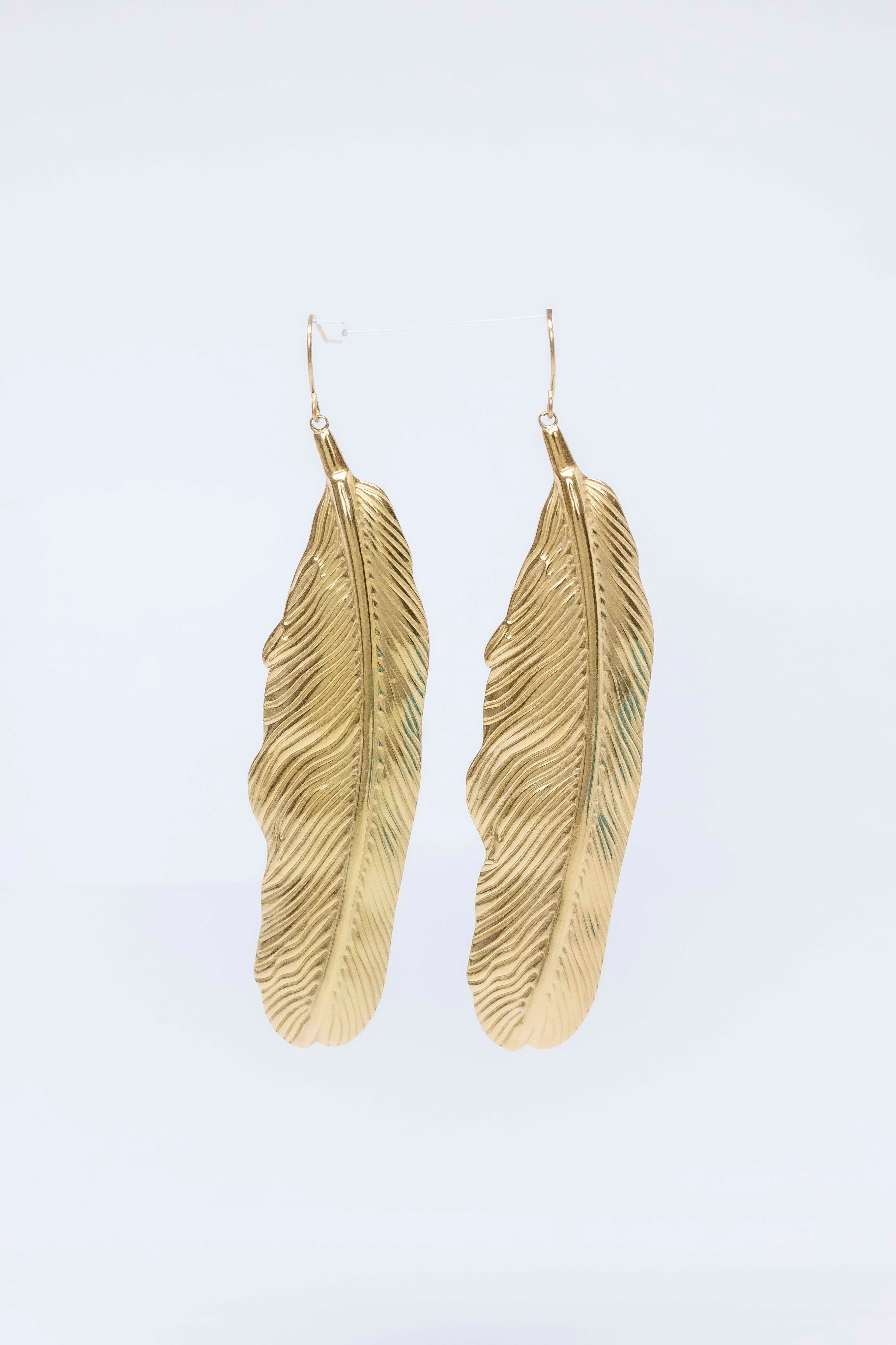 Pendientes maxi con diseño de pluma, acero chapado en oro 18 quilates y plata.